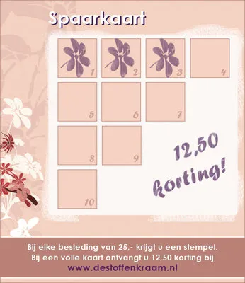 Bei jeder Bestellung im Werte von 25 Euro erhalten Sie einen Stempel, bei einem Einkaufsbetrag von 50 Euro demnach zwei Stempel und bei 75 Euro drei Stempel usw. (die Summe, anhand derer die Stempel berechnet werden, ist ausschließlich Versandkosten; Sie müssen also Artikel von mehr als 25 Euro bestellen, Versandkosten werden bei der Rabattberechnung nicht mit berücksichtigt).